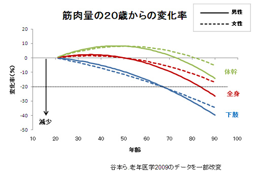 上のグラフの通り、20歳以降は徐々に筋肉量は減少に向かい、そのペースは60歳を超えると加速していきます。