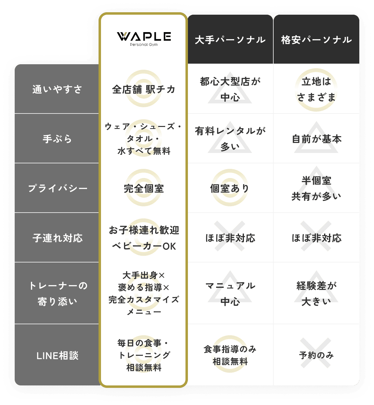 WAPLEなら、その日の気分や体調に合わせたカスタマイズ指導とあなたのペースに寄り添うサポートで、トレーニングが「楽しみ」に変わります。だからこそ自然と習慣化でき、多くの方が継続に成功しています!